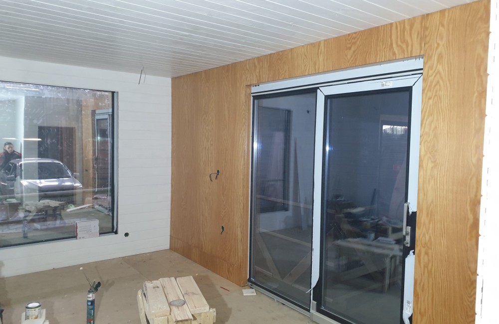 К усиленному фанерой каркасу мы можем крепить различные материалы для отделки стен, как правило это, имитация бруса или шлифованная декоративная фанера.