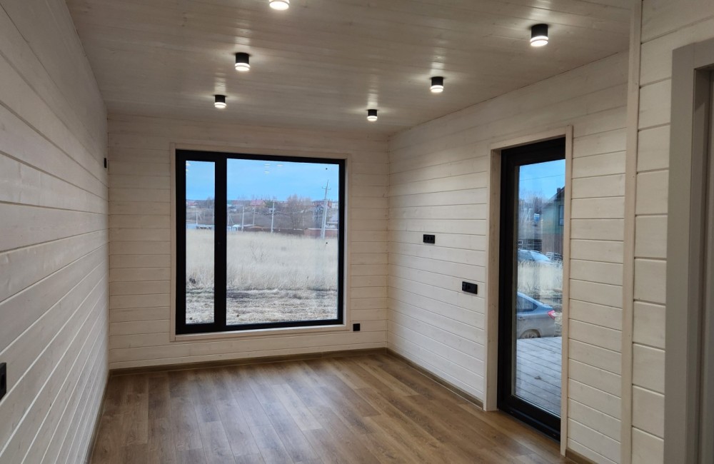 К усиленному фанерой каркасу мы можем крепить различные материалы для отделки стен, как правило это, имитация бруса или шлифованная декоративная фанера.